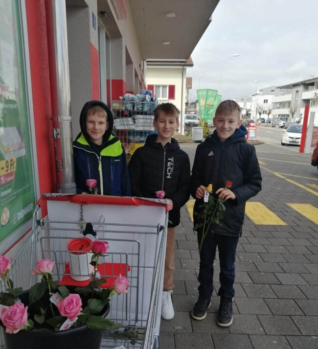 Am Rosenaktionstag verkauften die 5. Klässler*innen vom Religionsunterricht von Nottwil Fairtrade-Rosen.