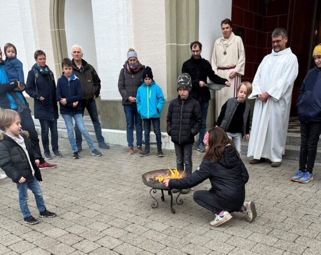 Für die Familienfeier am Aschermittwoch wartete eine Feuerschale auf dem Kirchenvorplatz.