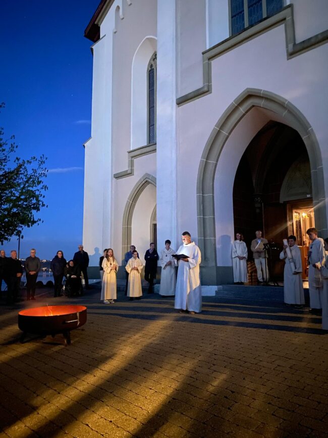 In der Osternacht feierten wir das neue Licht der Auferstehung am Feuer vor der Kirche. Damit entzündeten wir die Osterkerze und trugen sie in die dunkle Kirche. Sie soll ein Zeichen der Hoffnung sein in unserer unsicheren Welt. Wir erinnerten uns an die Taufe und den Glauben, in jeder Lebenslage vom Göttlichen getragen zu werden.…