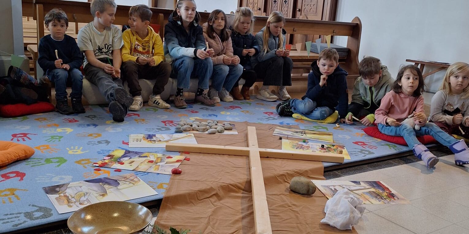 Familien trafen sich am Karfreitagvormittag, um an den Kreuzweg von Jesus zu denken und halfen bei der Gestaltung der Wegstationen mit. Während der Feier durften sie eine Raupe basteln, die sich an Ostern in einen Schmetterling verwandeln kann.