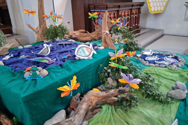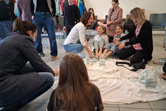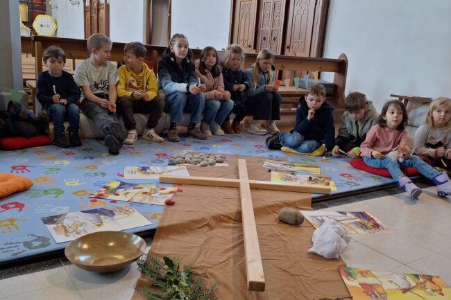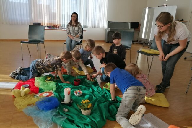 Familien trafen sich am Karfreitagvormittag, um an den Kreuzweg von Jesus zu denken und halfen bei der Gestaltung der Wegstationen mit. Während der Feier durften sie eine Raupe basteln, die sich an Ostern in einen Schmetterling verwandeln kann.